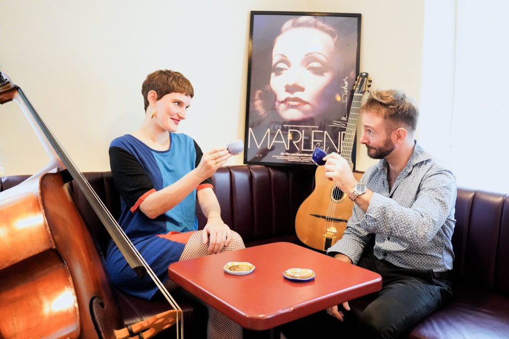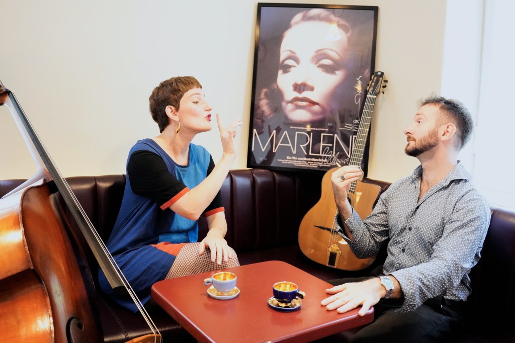 Hätte man ihr nicht Zarah Leander zum Einschlafen vorgesungen, hätte sie nicht in der Grundschule schon Nina Hagen gehört, würde nicht das überdimensionale Marlene Dietrich – Plakat über ihrem Klavier hängen, sie wäre wohl ein anderer Mensch, eine andere Künstlerin geworden. Wenn Antonia Dering diese alten und neuen deutschen Schlager singt klingt es immer natürlich, als würde sie mit der ihr eigenen Offenheit neben dir am Bartresen stehen und – nun ja vielleicht nicht aus dem Nähkästchen – aber doch aus der Kontrabass-Tasche plaudern. Und wird sie in den Liedern mal doch dramatisch, schmalzig und schmonzettig, dann stets bewusst und mit Schalk hinter den Ohren. In Ihrem Programm „Die Leute schauen schon!“ begleitet sie sich – auf den Spuren ihrer emanzipierten schillernden Vorbilder – selbst am Kontrabass und erfreut sich zugleich am Spiel mit ihrem hervorragenden Kollegen Giangiacomo Rosso an der Gypsy Gitarre. Da kann es natürlich schon vorkommen, dass der ein oder andere Italo-Schlager von Mina oder Sophia Loren in das Programm tänzelt – „Diva“ ist ja nicht umsonst ein italienisches Wort.